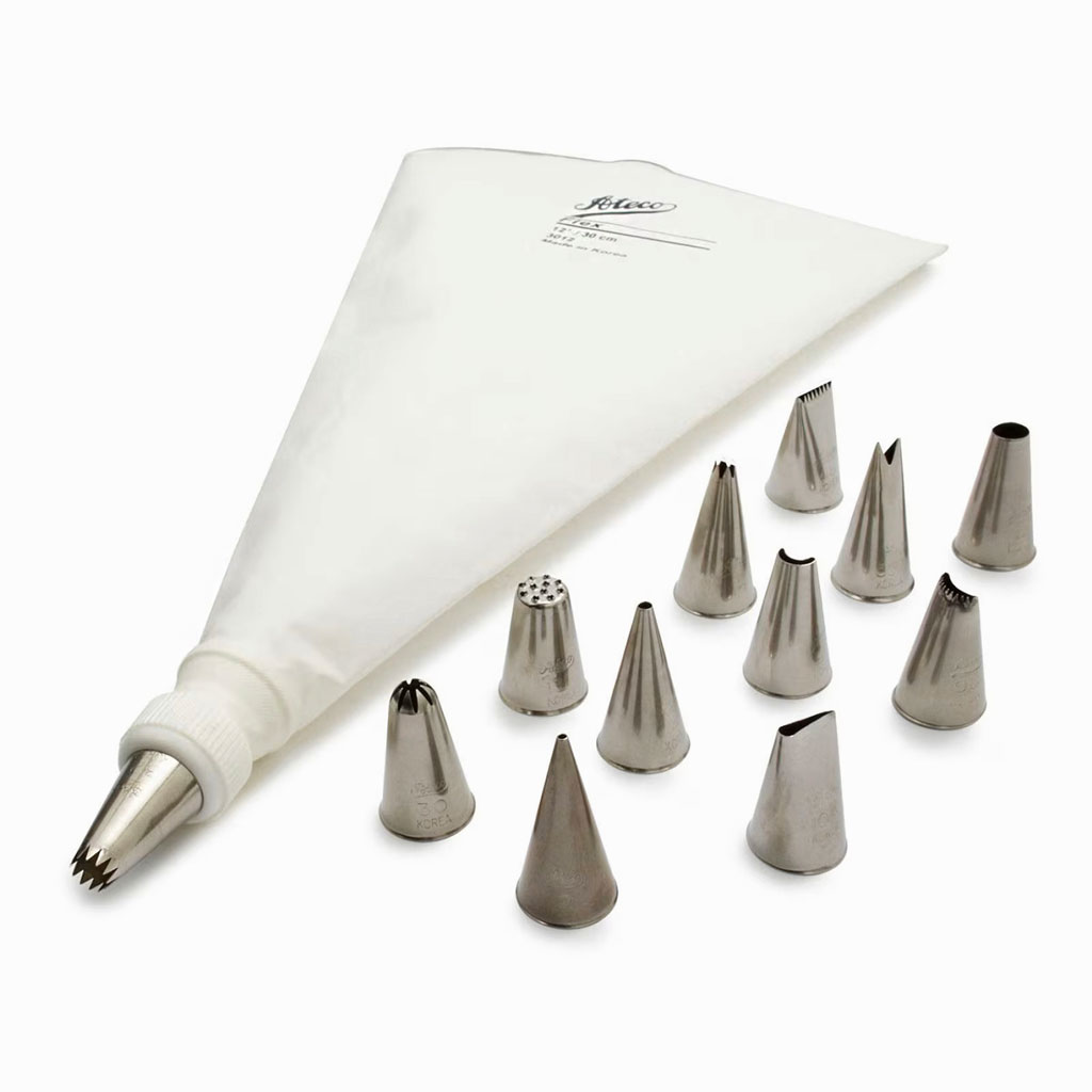 This 14-piece set comes with 12 of the most popular cake decorating tips, a 12" Polyurethane coated Nylon flex bag with a hanging loop, a plastic coupler (pre-attached to pastry bag), instructions, recipes and a clear plastic storage box.