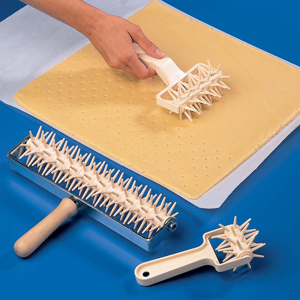 A roller docker is used to pierce the dough to let out air during the cooking process.